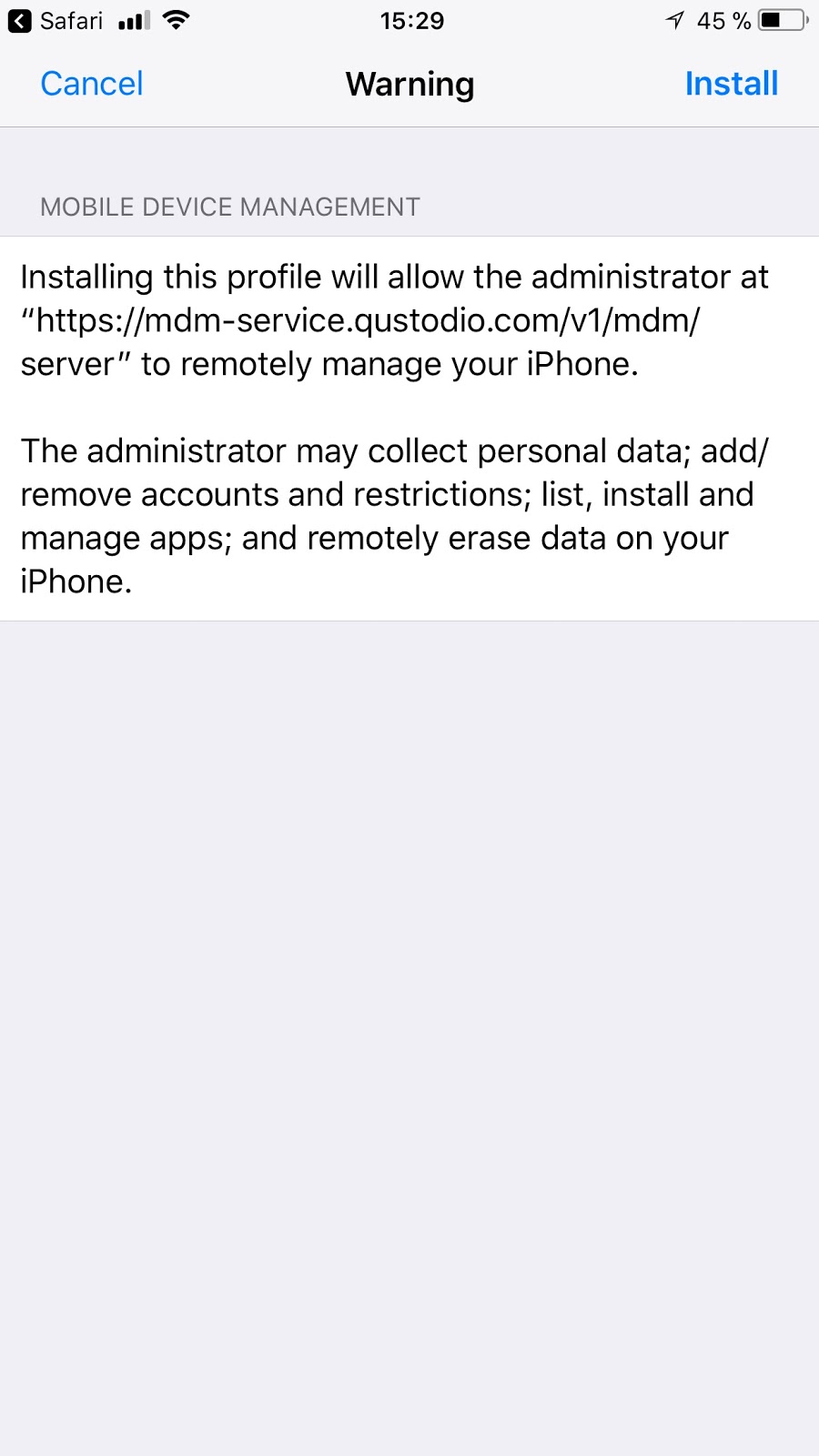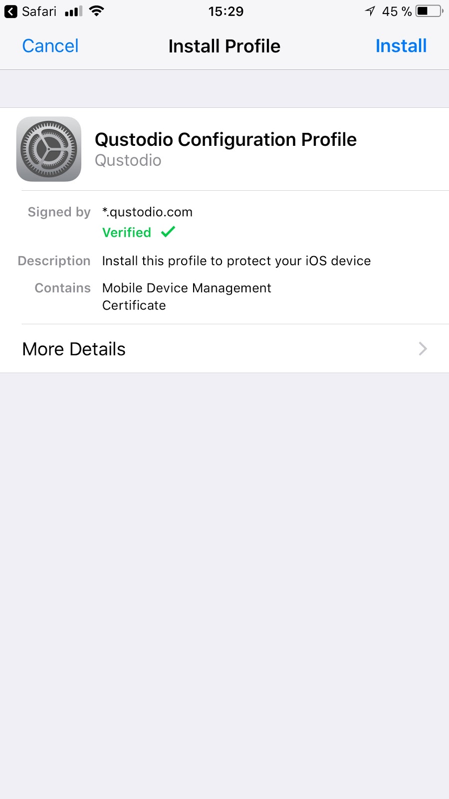 Qustodio requiere que el perfil iOS MDM esté instalado y habilitado en el dispositivo iOS que deseas proteger para que Qustodio pueda monitorizar el dispositivo y aplicar la protección y límites de tiempo.